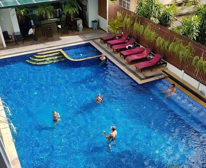 The rooftop pool offers limited skyline views of the Andaman Sea and surrounding buildings. The small outdoor pool features a wood tile pool deck.